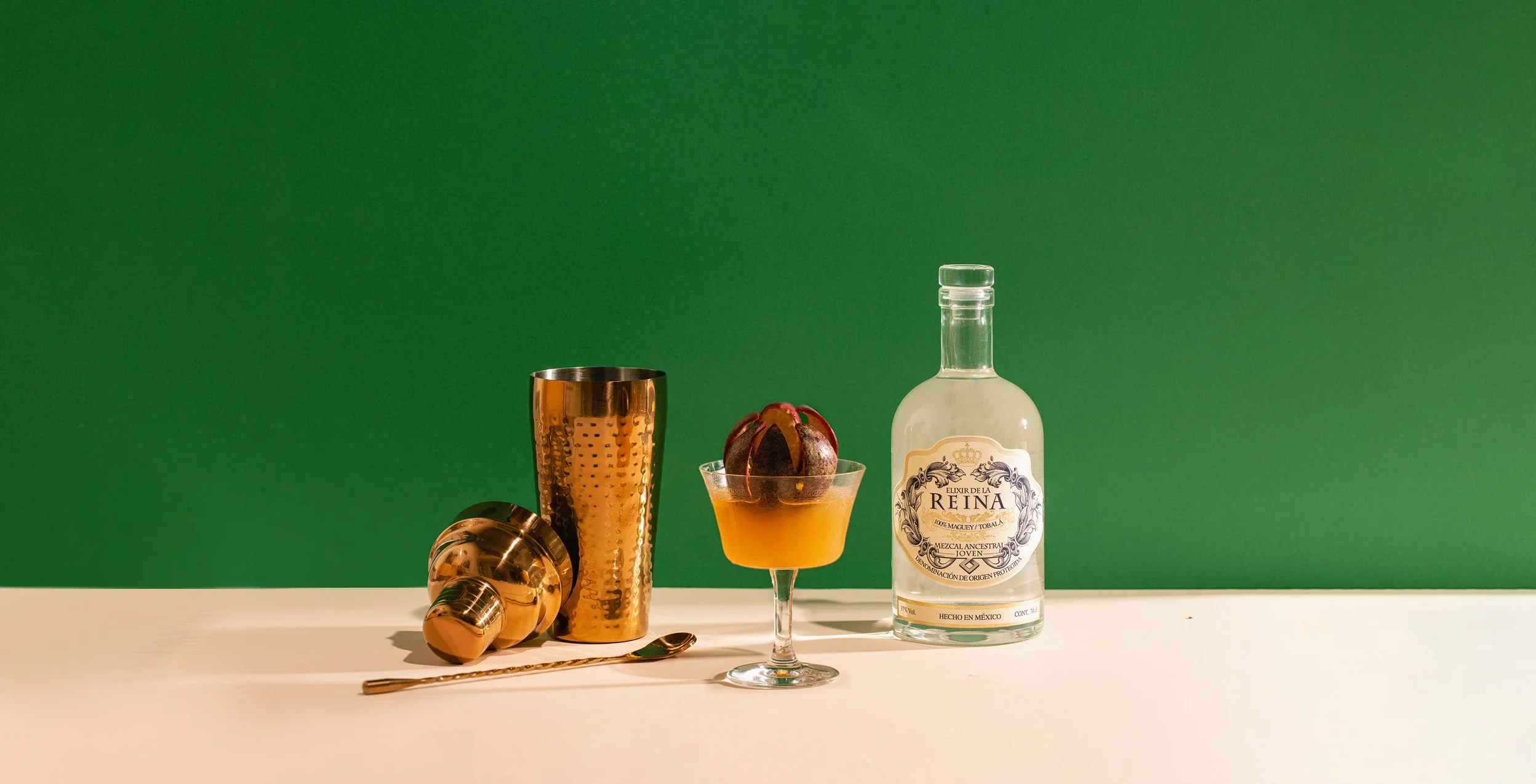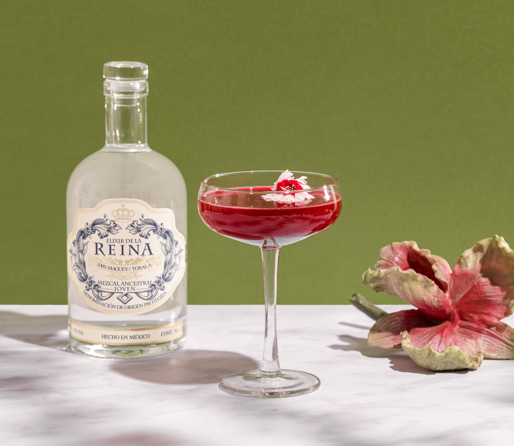 Mezcal Reina with a hibiscus and rose mix of bitters and seltzer. Served straight up