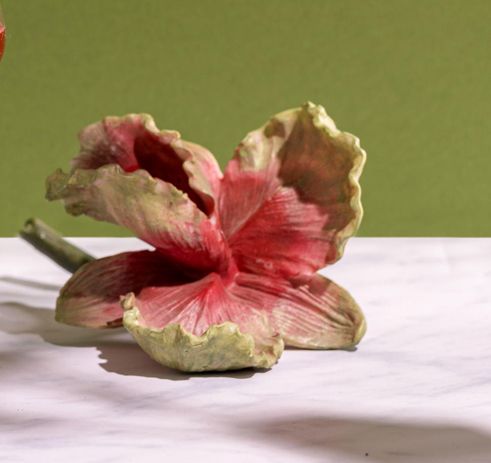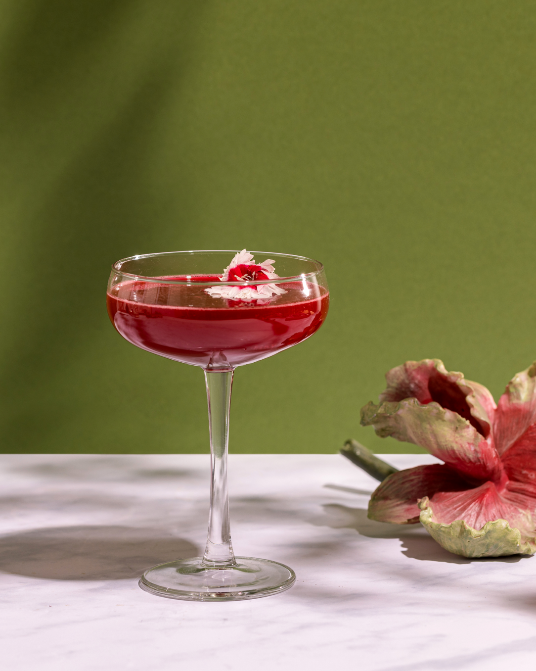 Garnished with a hibiscus flower in syrup